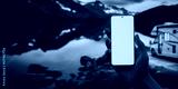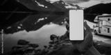 CU Caucasian male using his phone near the RV in the evening. Phone mockup