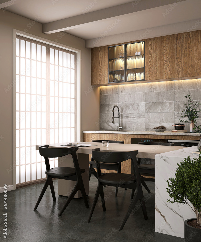 Luxury dining room and kitchen with island, table, chair, counter cabinet with sink, cupboard, led light, in sunlight from window for luxury interior decoration, cooking, dining product background 3D