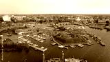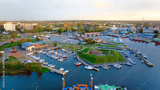 A breathtaking aerial drone photo of Kołobrzeg's marina in Poland captures a picturesque scene. The view showcases a multitude of yachts, sailboats, fishing boats and ships.
