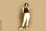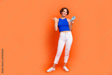 Full body portrait of gorgeous nice lady hold smart phone indicate finger empty space ad isolated on orange color background