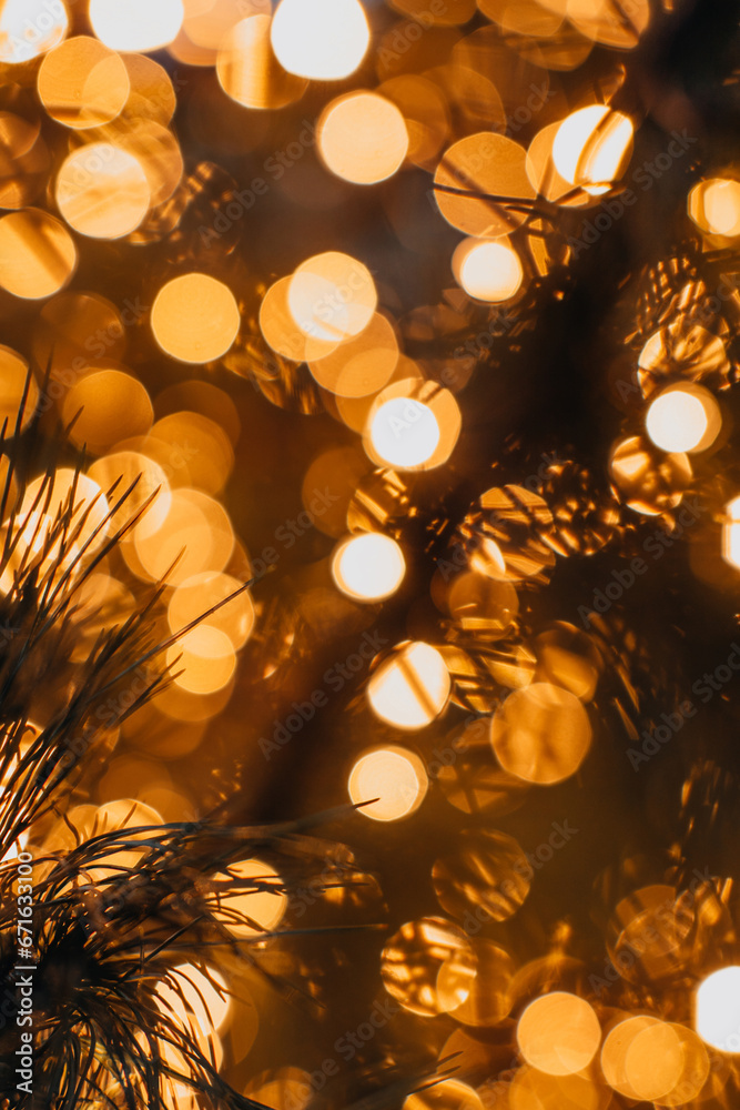 New Year sparkling background for greeting card. Golden magic glittering bokeh lights of festive Christmas garland.