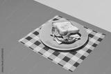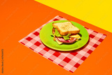 Plate with club sandwich with grilled bread, ham, lettuce, cheese, tomato and avocado on checkered napkin. Concept of breakfast, food, taste, cooking, ingredients. Complementary colors. Poster, ad