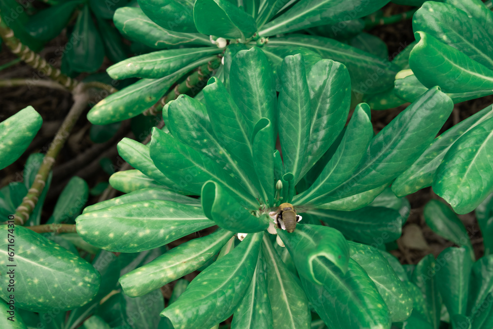 Beach naupaka, Scaevola taccada, or sea lettuce branch with green shiny leaves.
