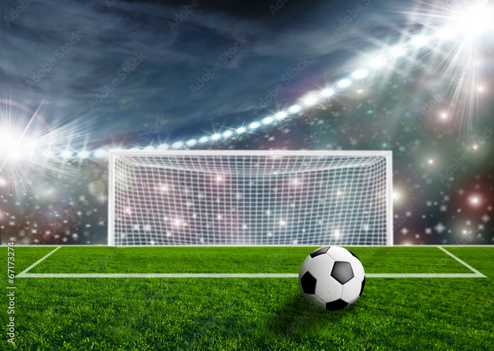 Soccer ball on green stadium arena