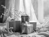 Natural beige gift boxes wrapped in brown paper and ribbons with flowers and natural sunlight