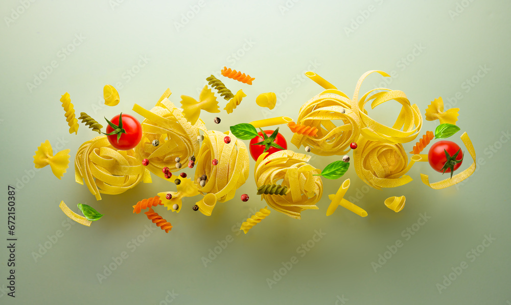 Uncooked mix of pasta flying with tomatoes and basil on green background
