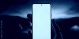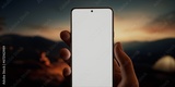 CU Caucasian male using his phone near campsite in the evening, screen mockup