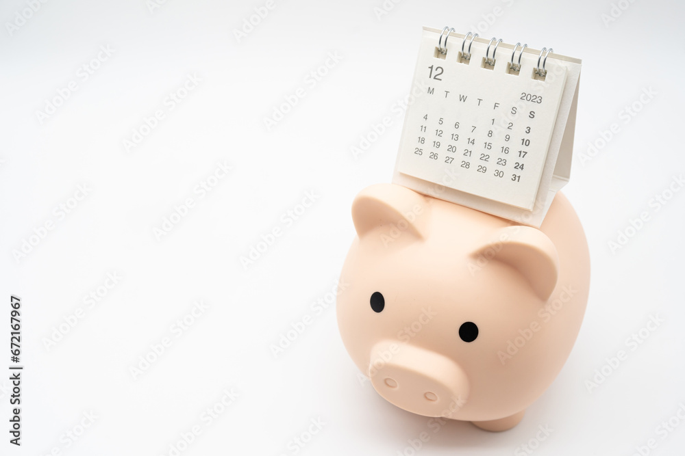 Travel planning and budget concept. Calendar and piggy bank to collecting money for vacation trip. Preparing for vacation.