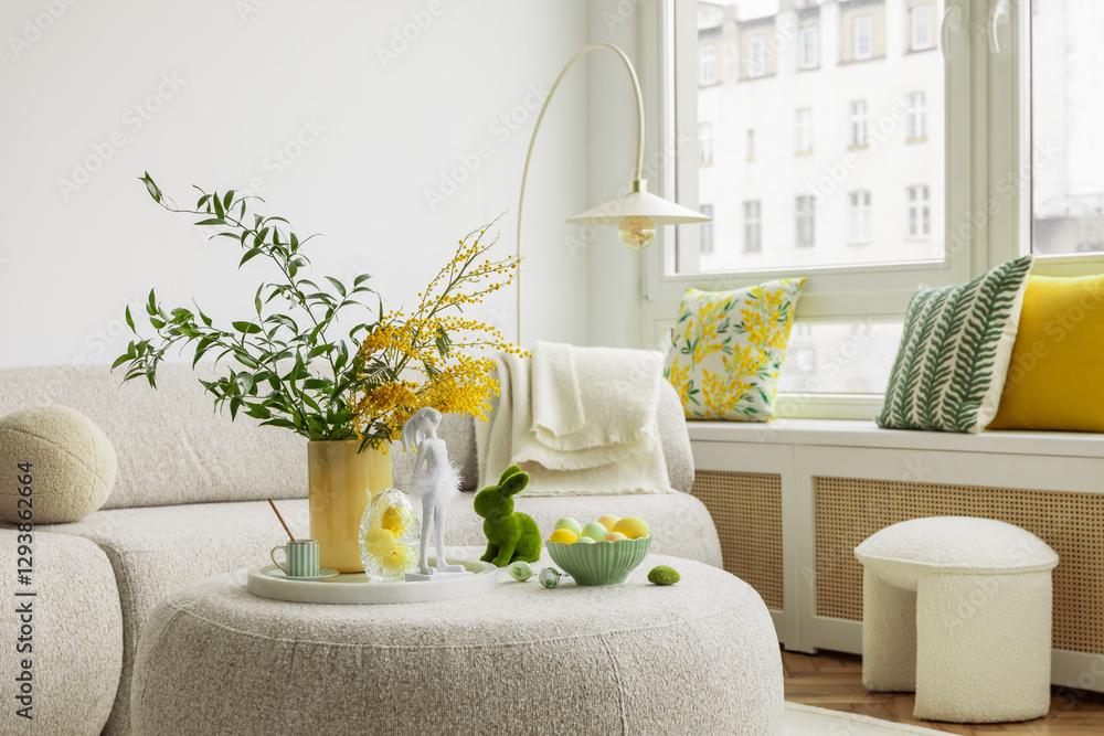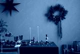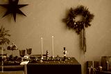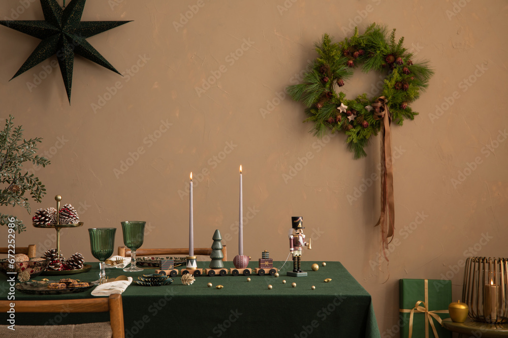 Interior design of warm dinning room interior with christmas table, wooden console, christmas gifts, gingerbread, candle, star on wall christmas wreath and personal accessories. Home decor. Template.