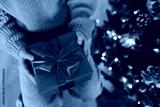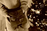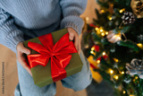 Closeup top view of unrecognizable little girl holding Christmas present gift box while sitting under xmas tree illuminated with garland in morning. Concept of home festive atmosphere.