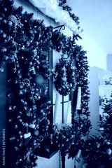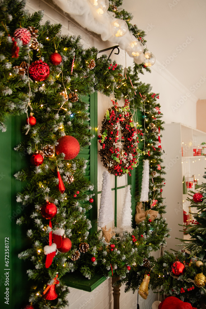 Christmas porch with a wreath on the doors in red and green colors. Decorating the facade of a house for the holiday.