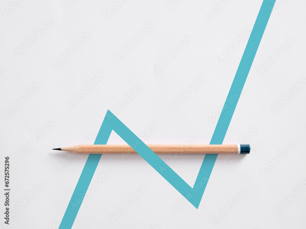 Minimalist template of a wooden pencil breaking through the blue graph lines on white background. Abstract minimal design.