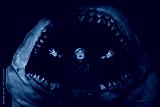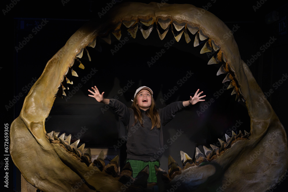 The jaw of a giant shark, a sea monster in the installation. Teenage girl is terrified