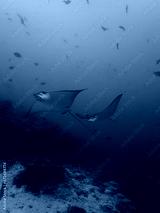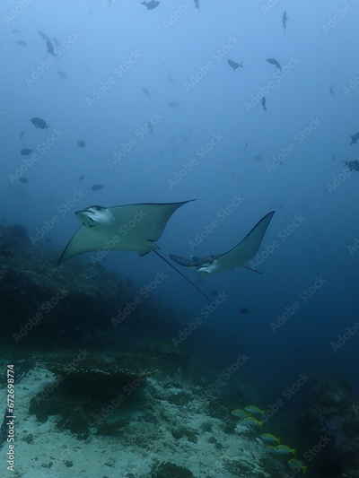spotted eagle rays swimming underwater in the maldives, surrounded by trigger fish