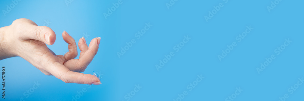 soft contact lens on the finger closeup, Optic health, Clear eyesight, Ophthalmic correction, banner, blue background