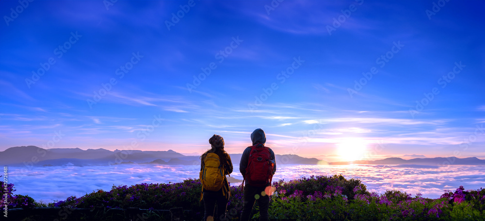 asian couples Tourists with backpacks Standing watching landscape view on the mountain,Beautiful landscape And the light of the beautiful sun on the Sky