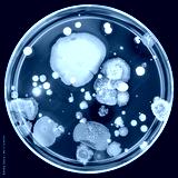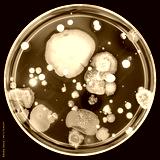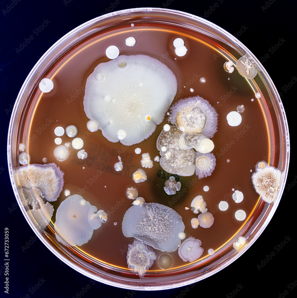 colonies of bacteria and microorganisms on the surface of agar and wind during microbiological analysis in a scientific laboratory