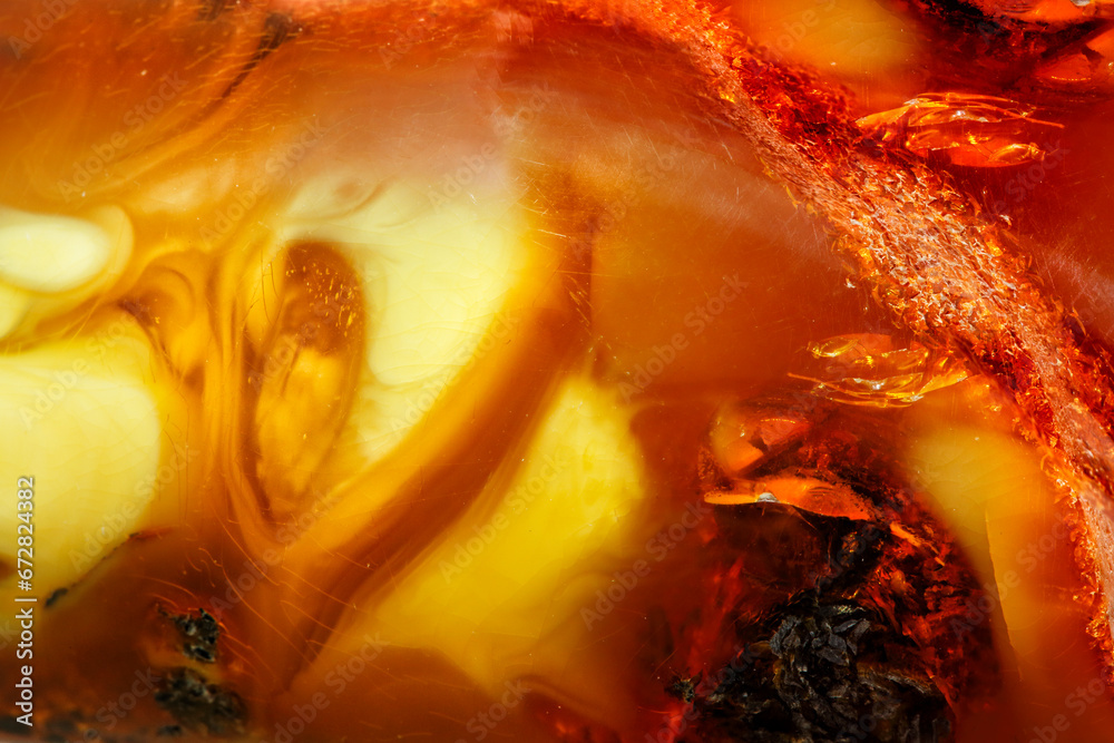 Amber texture. A natural mineral with bright patterns. Semi-precious mineral for jewelers. Copal. Ancient fossil resin. Geology