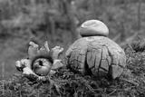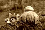 Amazing mushrooms of Geastrum rufescens (Rufous earthstar) in forest - young and older mushroom.