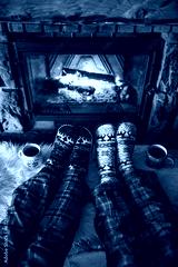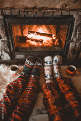Feet in woollen socks by the Christmas fireplace. Couple sitting under the blanket, relaxes by warm fire and warming up their feet in woollen socks. Winter and Christmas holidays concept.