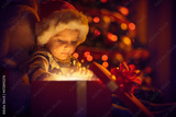 Little boy opening gifts near Christmas tree at home