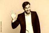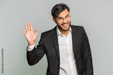 Indian businessman smiling friendly at camera, waving hands gesturing hello greeting or goodbye welcoming with invitation hospitable expression. Arabian Hindu man isolated on gray studio background