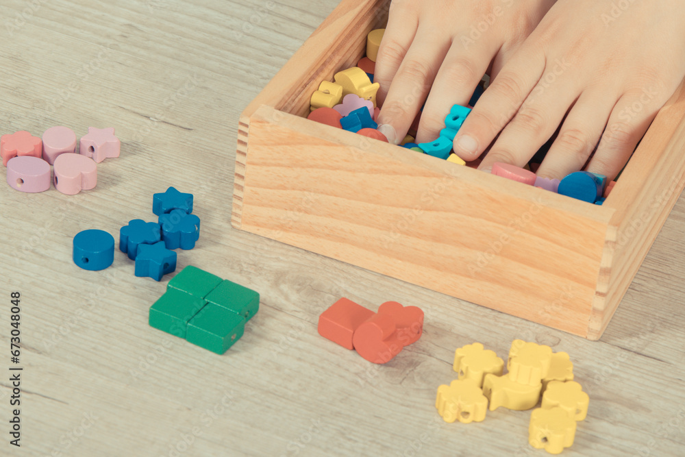 Hands of baby playing thread and wooden beads used to making bracelets. Development of kids motor skills, coordination and logical thinking