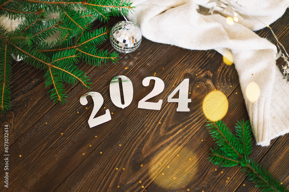 Happy New Years 2024. Christmas background with Christmas tree and Christmas decorations. Christmas holiday celebration. New Year concept..