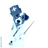 Smart jack russell terrier puppy wearing like a doctor with stethoscope on his neck pointing away on empty space. isolated on white background