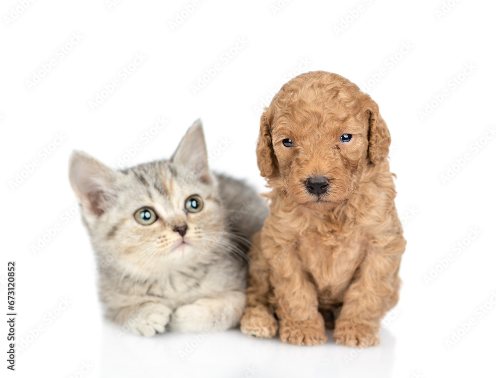Toy poodle puppy and kitten lying together and looking at camera. isolated on white background