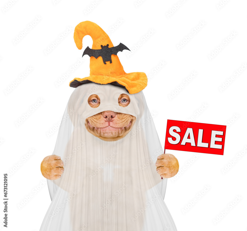 Smiling Mastiff puppy dog celebrating halloween in ghost costume shows signboard with labeled "sale". Isolated on white background