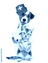 Smart jack russell terrier wearing like a doctor with stethoscope on his neck hugs tiny kitten. isolated on white background