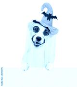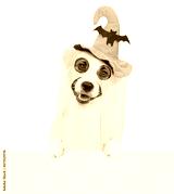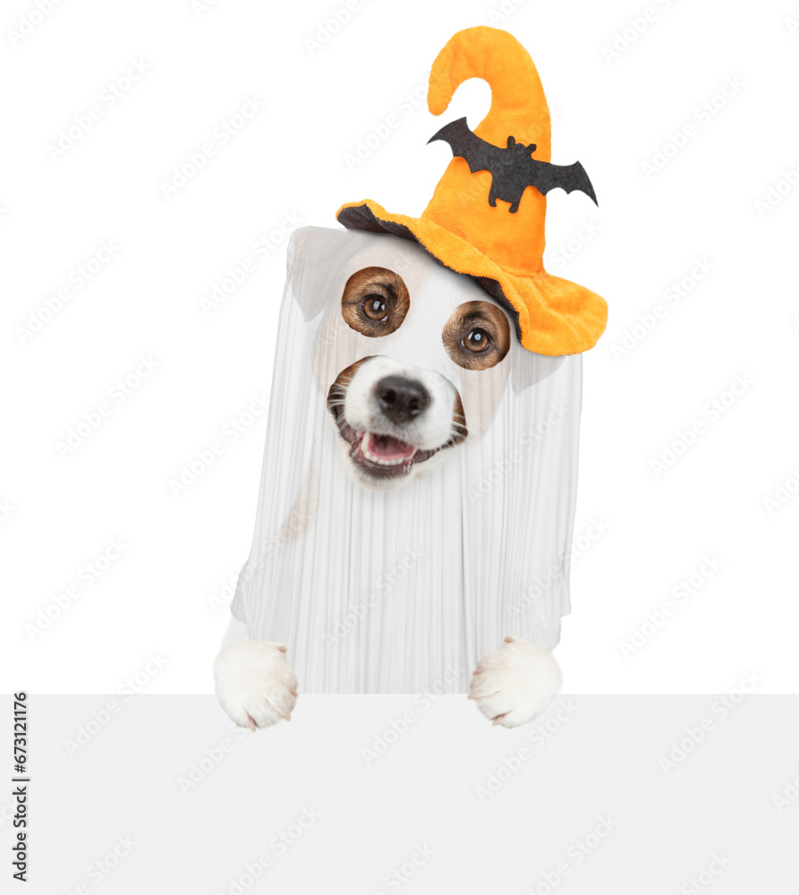 Jack russell terrier puppy celebrating halloween in ghost costume with funny hat looking above empty white banner. Isolated on white background