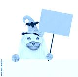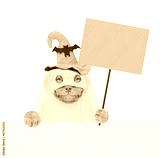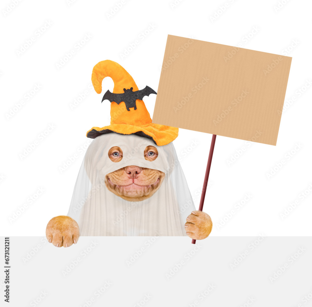 Smiling Mastiff puppy dog wearing a costume for Halloween party like a ghost shows empty placard above empty white banner. Isolated on white background