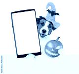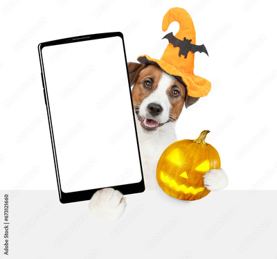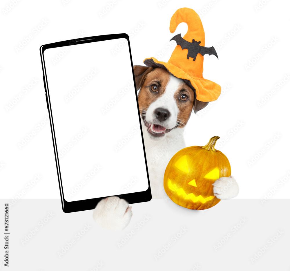 Funny Jack russell terrier puppy wearing hat for halloween holding dlowing pumpkin and showing big smartphone with white blank screen in it paw above empty white banner. Isolated on white background
