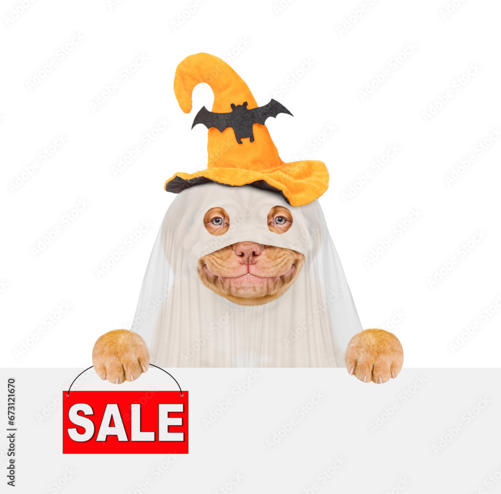 Smiling Mastiff puppy dog celebrating halloween in ghost costume with funny hat showing signboard with labeled "sale" and looking above empty white banner. Isolated on white background