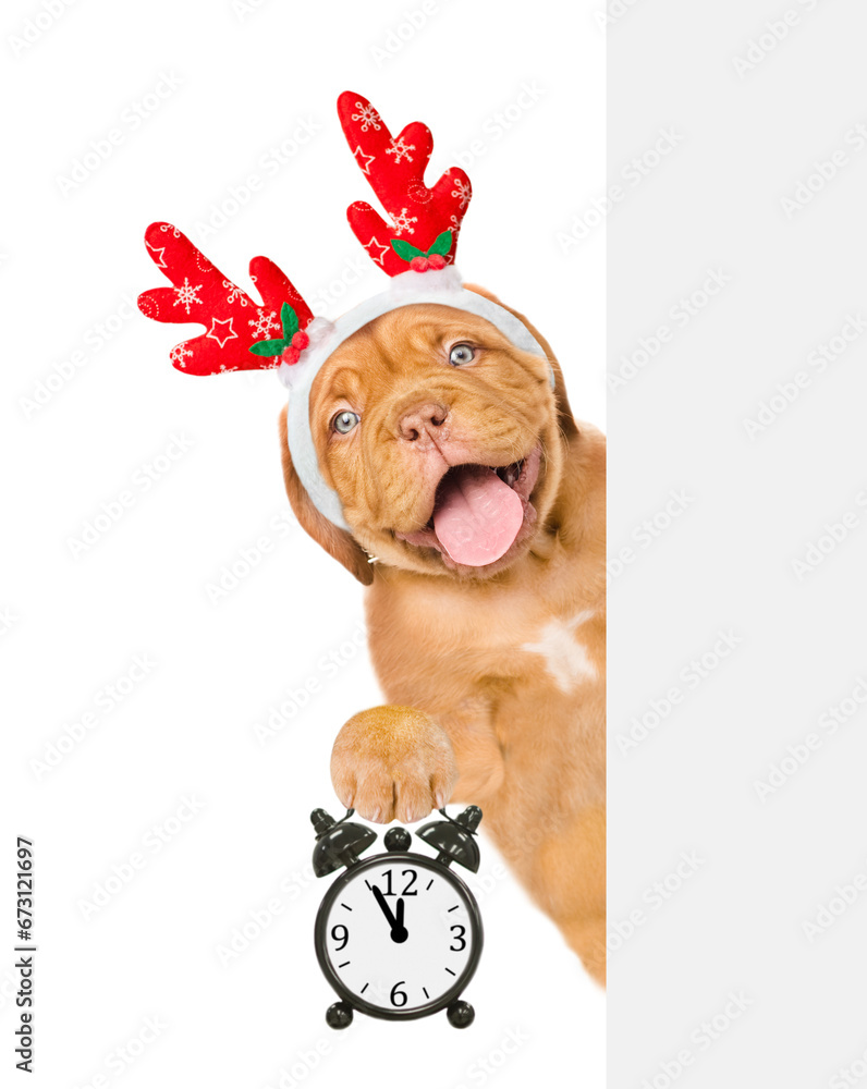 Happy Mastiff puppy dressed like santa claus reindeer Rudolf shows alarm clock in it paw behind empty white banner. isolated on white background