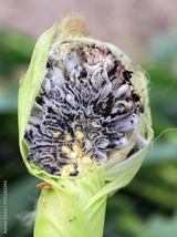 Corn smut (Ustilago maydis) is a fungus parasite of corn. Is an edible fungus highly valued in Mexico known as huitlacoche. Cross-section through an infected corn cob.