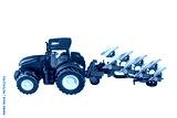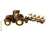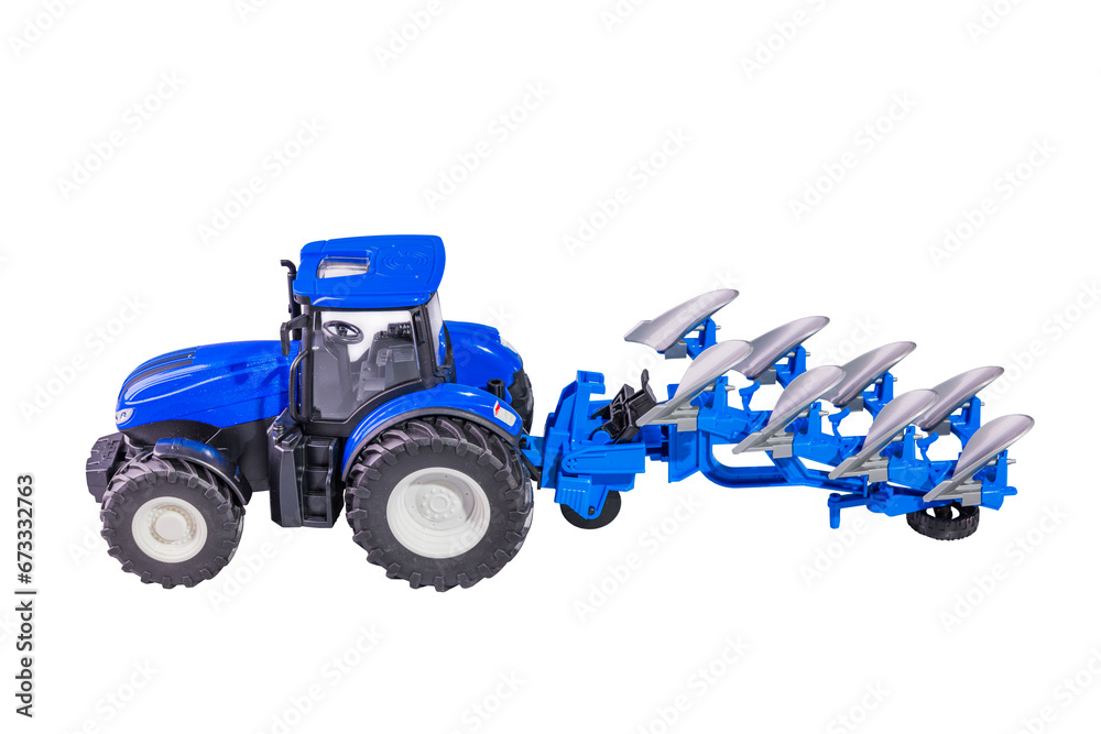 Isolated view of radio-controlled toy farm tractor model with plow on white background.