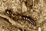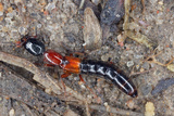 A tiny beetle Xantholinus fortepunctatus from the Rove beetle (Staphylinidae) family. Common in the soil in agrocenoses and cultivated fields. A beneficial, predator that eats plant pests.