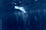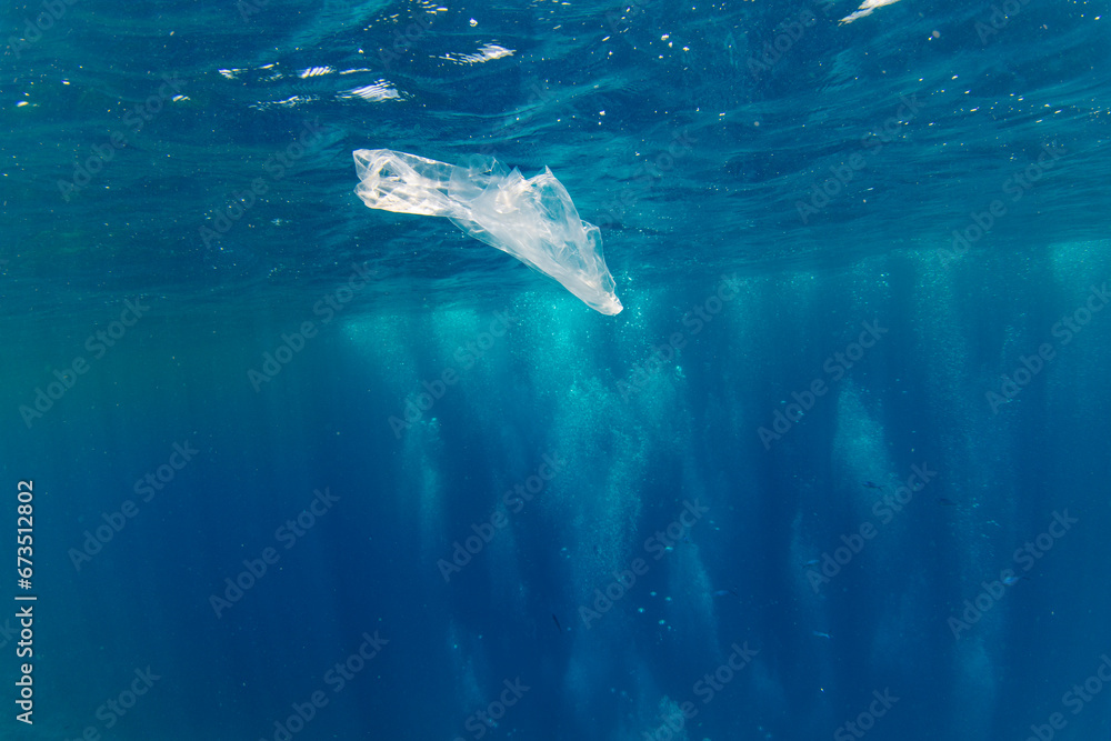 Plastic bag floating underwater on the blue depth, environmental pollution. Plastic pollution of Ocean