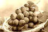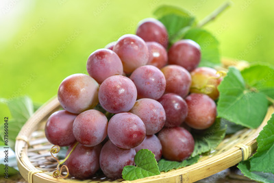 Fresh Red Queen Nina Grape in basket over blurred greenery background, Japanese Grape in wooden basket on wooden table in garden.