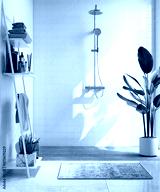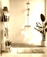 Shower enclosure in bathroom with modern shelf with decorative item ,rain shower, green tropical banana tree in sunlight in white square tile wall for interior design decoration, product background 3D