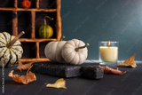 Cozy still life with small decorative pumpkins and aroma candle