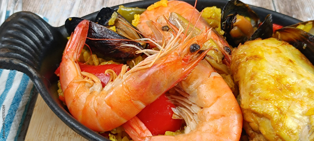 plat de paella, en gros plan, sur une table