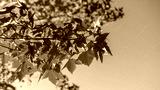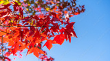 Autumn leaves of red color maple tree, fall season change blur background, view under tree looking upward against blue sky with sun flare and blurry colorful season