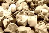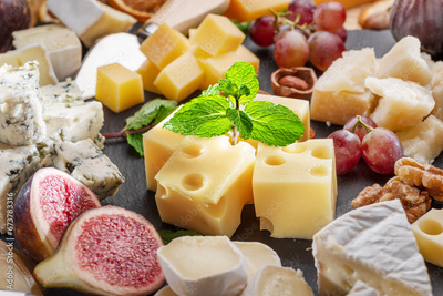 Variety of sliced cheeses with fruits, mint, nuts and cheese cutting knives.