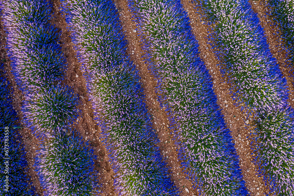 Lavender field in blossom. Aerial view on rows of lavender bushes. Brihuega, Spain.