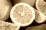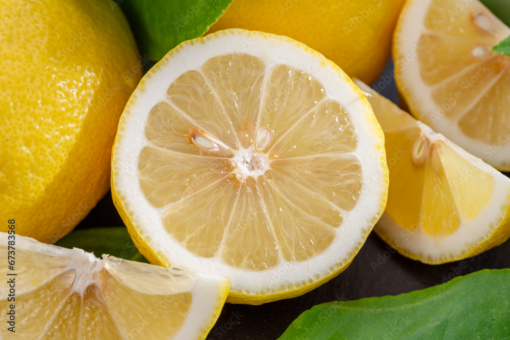 Ripe lemon fruits with slices and lemon leaves on a gray stone table.