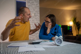 Affordable Housing Crisis. Man Arguing while Women Feeling Stressed at Table. Domestic violence against a woman. Couple with problems. Failure of life.